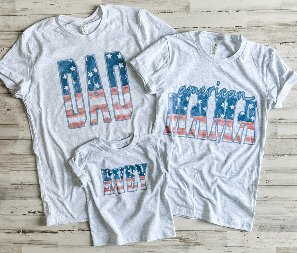 Adorable patriotic print that can be worn by the whole family. You can customize this (up to seven characters!) just know that the more characters, the smaller the print to keep the resolution and details. Ex. America vs Dad, you can tell the size difference!